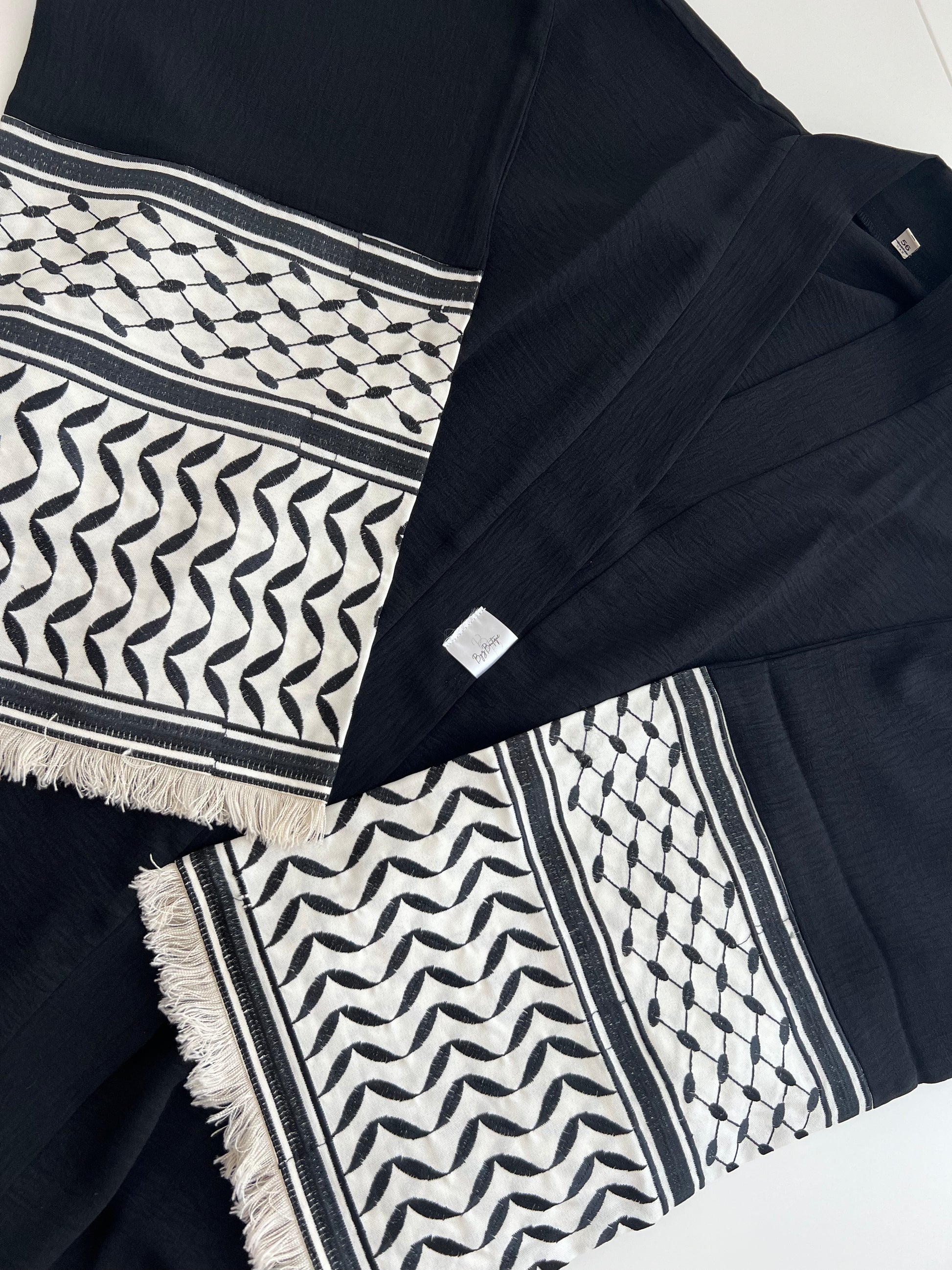 Make a statement with this striking black abaya, featuring sleeves adorned with a keffiyeh-inspired design that celebrates heritage and style. Crafted in Dubai from a lightweight, comfortable fabric, it’s perfect for blending tradition with modern elegance. A unique piece for every occasion. 🖤
