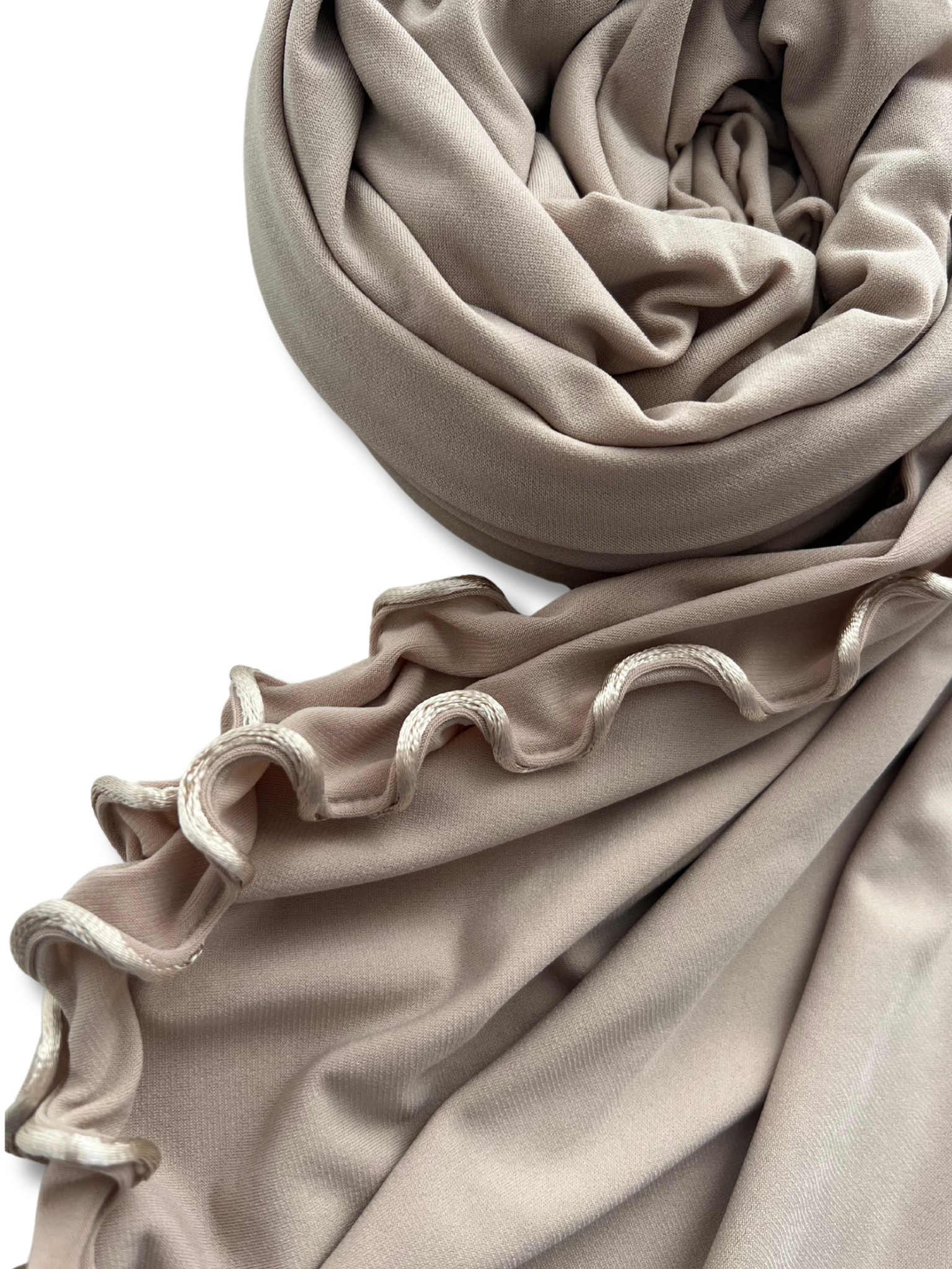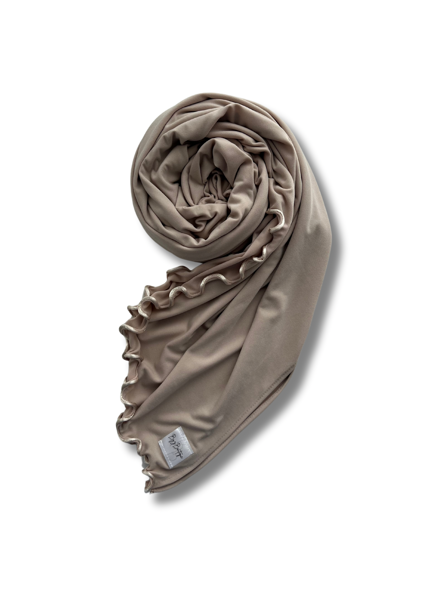 This is the "line" version of our Premium jersey hijab. Meaning the edges contain a wavy satin cord. This makes your daily outfit stand out, making it more chique and appealing to the eye.