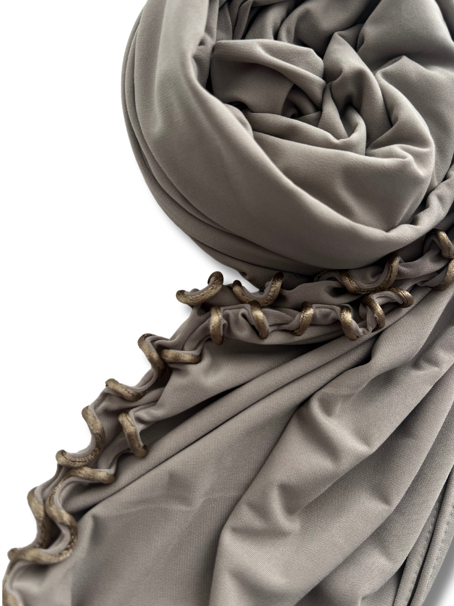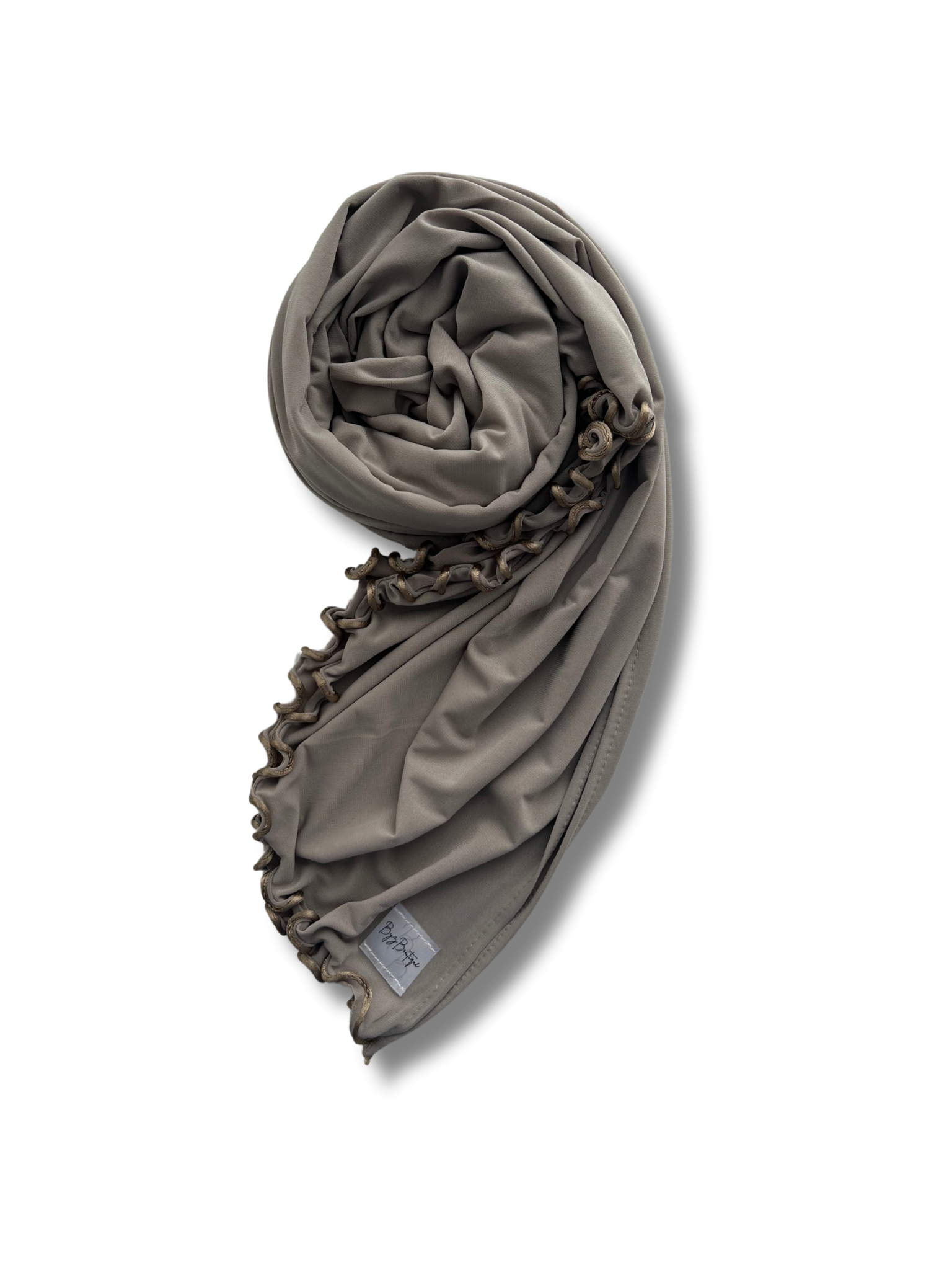 This is the "line" version of our Premium jersey hijab. Meaning the edges contain a wavy satin cord. This makes your daily outfit stand out, making it more chique and appealing to the eye.