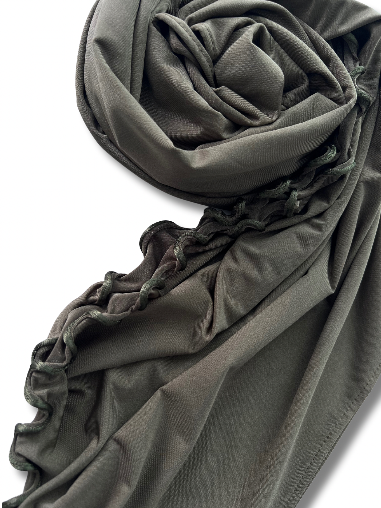 This is the Satin version of our Premium jersey hijabs, which has the same trusted quality, just a different fabric. The satin version has a luxurious appearance making it the perfect choice for special occasions or just for daily wear. This is the "line" version of our Premium jersey hijab. Meaning the edges contain a wavy satin cord. This makes your daily outfit stand out, making it more chique and appealing to the eye.