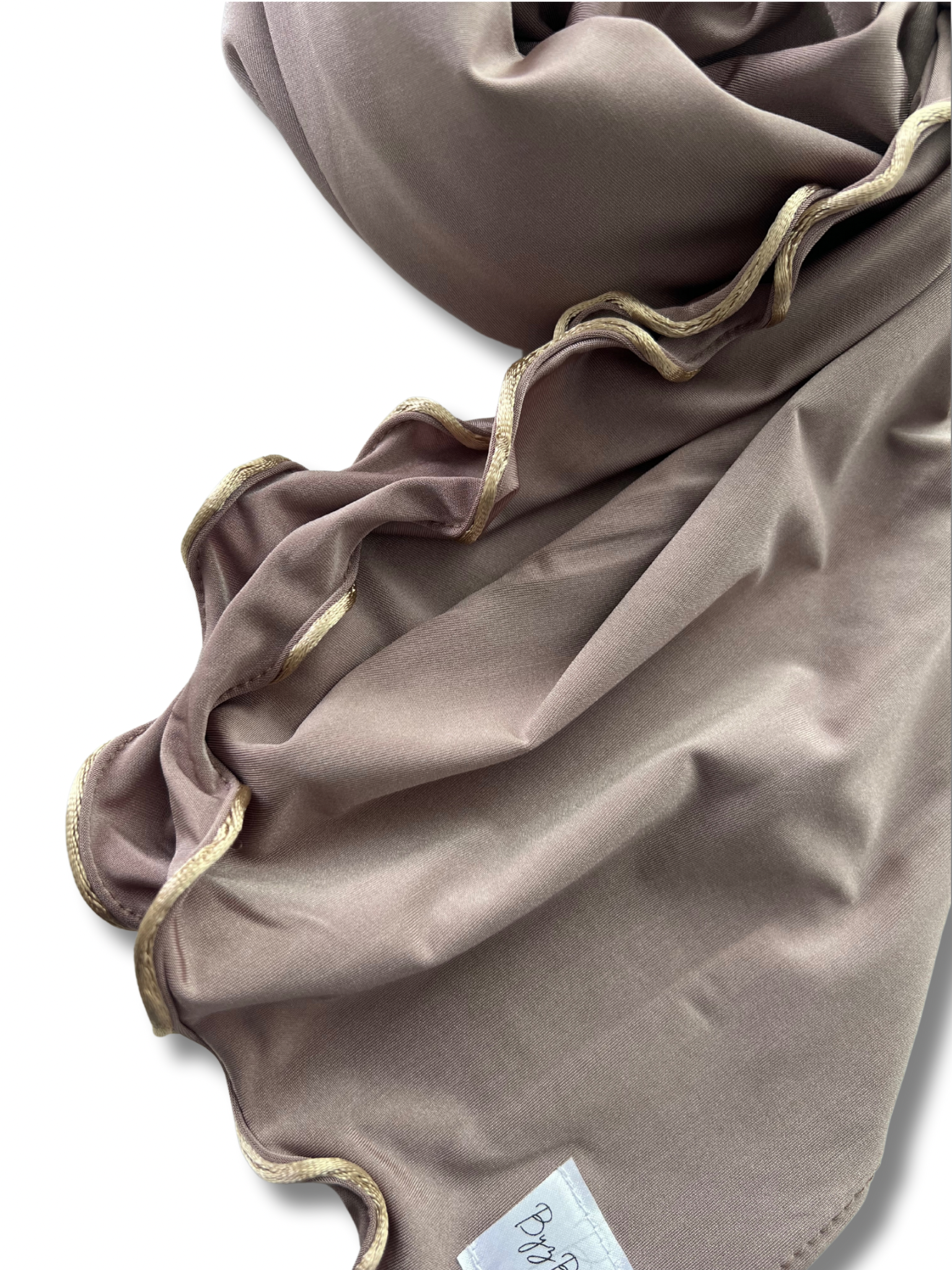 This is the Satin version of our Premium jersey hijabs, which has the same trusted quality, just a different fabric. The satin version has a luxurious appearance making it the perfect choice for special occasions or just for daily wear. This is the "line" version of our Premium jersey hijab. Meaning the edges contain a wavy satin cord. This makes your daily outfit stand out, making it more chique and appealing to the eye.