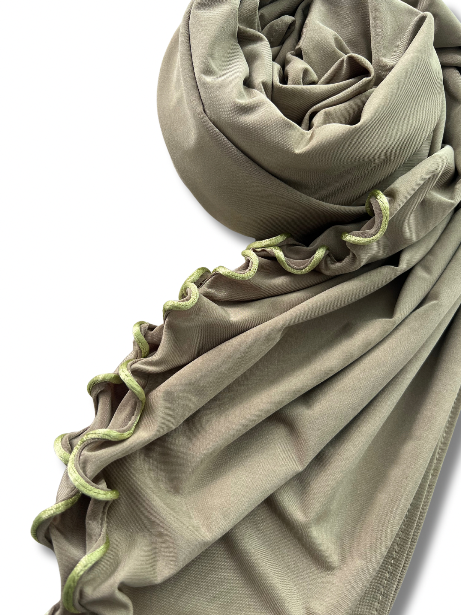 This is the Satin version of our Premium jersey hijabs, which has the same trusted quality, just a different fabric. The satin version has a luxurious appearance making it the perfect choice for special occasions or just for daily wear. This is the "line" version of our Premium jersey hijab. Meaning the edges contain a wavy satin cord. This makes your daily outfit stand out, making it more chique and appealing to the eye.